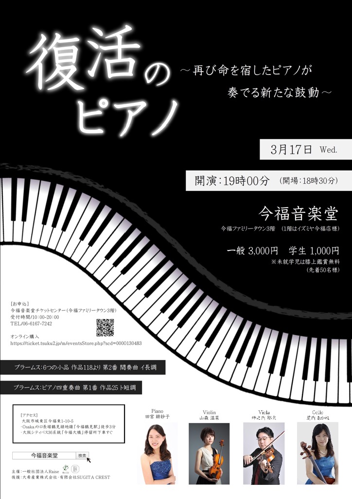音楽寺子屋に併設している、今福音楽堂(コンサートホール)にて、3月17日(水)19:00~ピアノコンサートを開催致します!